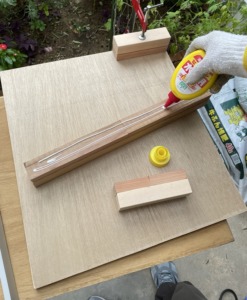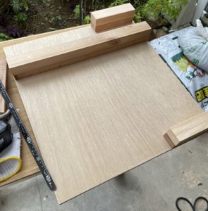 縦横それぞれ60㎝ほどのコンパネに、写真の位置に垂木を切ってボンドでくっつけます。