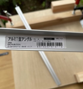 これに丸鋸をスライドさせるためのレールとして、アルミのLアングルを取り付ける予定でしたが、丸鋸はソコソコ重さがあるので2mm厚以上の丈夫なL型のアングルが必要だったが店舗に在庫がなかったので、今回は曲げに強いT型のアングルを購入しました。