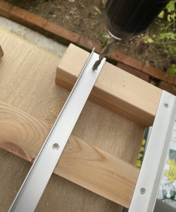 丸鋸のベースの幅に合わせて、スムーズにスライドできるように、2本のT型アルミアングルを取り付けます。