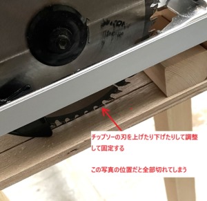 丸鋸は、元々ベースに対して刃を上げたり下げたりできるようになっており、、全部切り落とす場合には次の写真のように一番下まで刃を下げて使います。