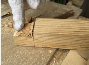 柱材を取り出して、同様に切り込みを入れた部分を指で取り除き、若干残った部分をノミなどで削ぎ落すと出来上がりです。(私はノミを持っていないので中学生の時に使った彫刻刀を使いました)