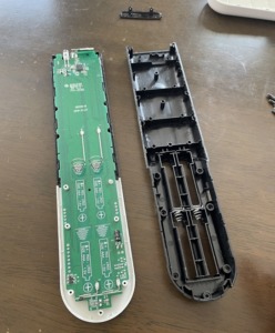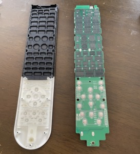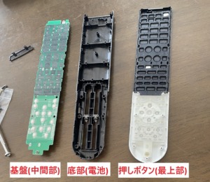 とりあえず、リモコンの裏ふたを開けて内部(特にゴムと基盤の接触面)を確認することにしました。