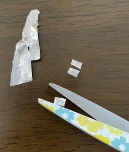 台所にあったアルミホイルを少し千切って、まずはこれに両面テープを貼り付けた。
